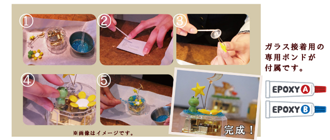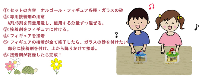 世界に一つだけ! オルゴールにガラス/プラスチックフィギュアをトッピングする商品です。 【商品のセット内容】 ・オルゴール ・ガラス/プラスチック フィギュア各種 ・ガラスの砂 ・ガラス専用 ボンド レイアウトを決めて自分だけのオリジナルデザインのオルゴールを作ろう♪